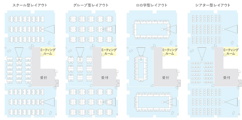用途に合わせてスクール型、グループ型、ロの字型、シアター型のレイアウトでお使いいただけます。